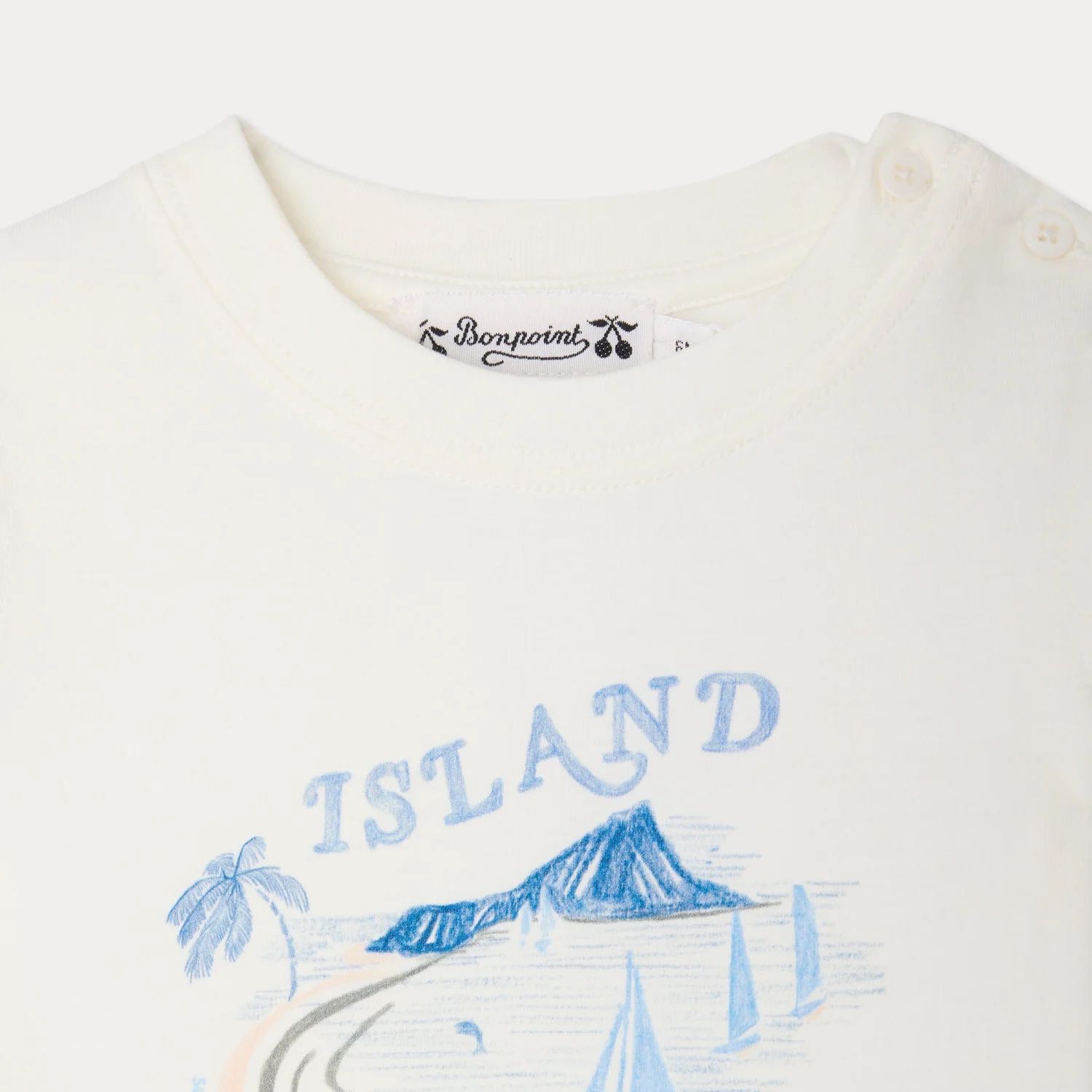フロントにアイランドモチーフのプリントをあしらったTシャツ。オーガニックコットン素材を使用し、肩部分にはボタンを配した実用的なデザインです。