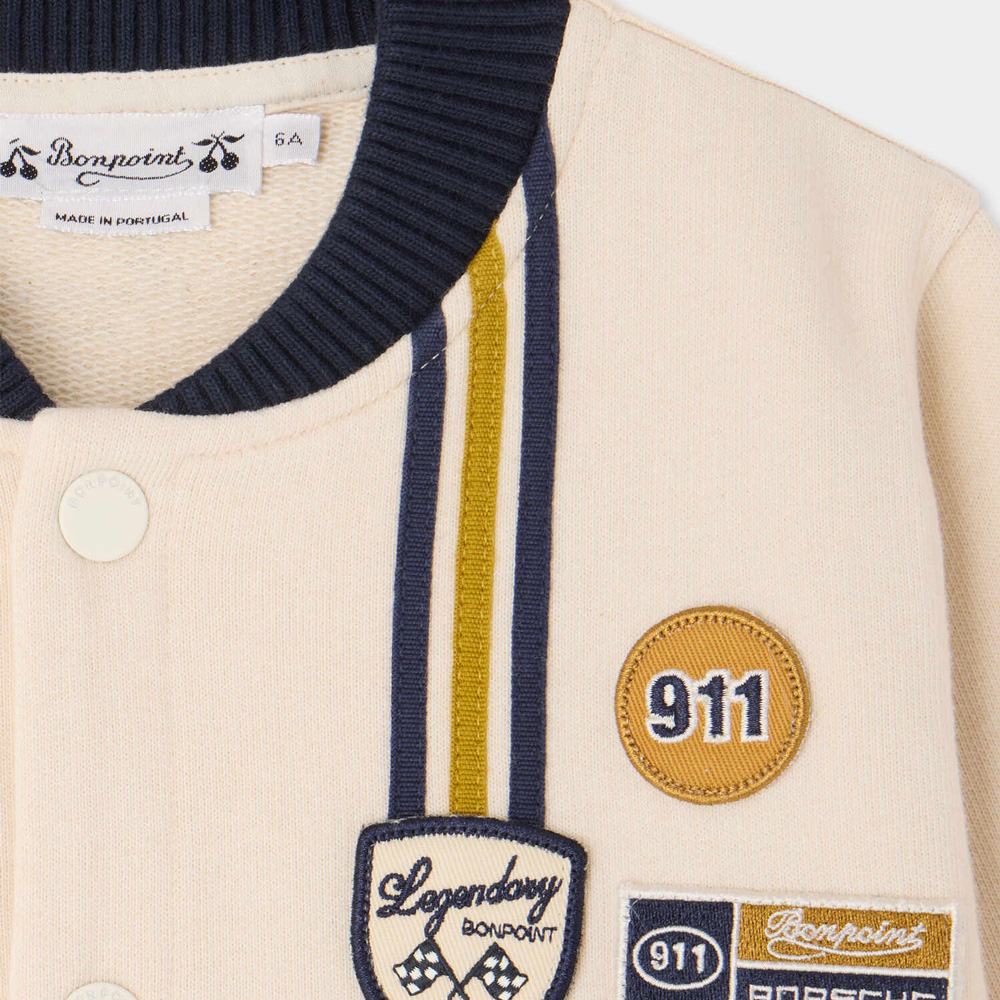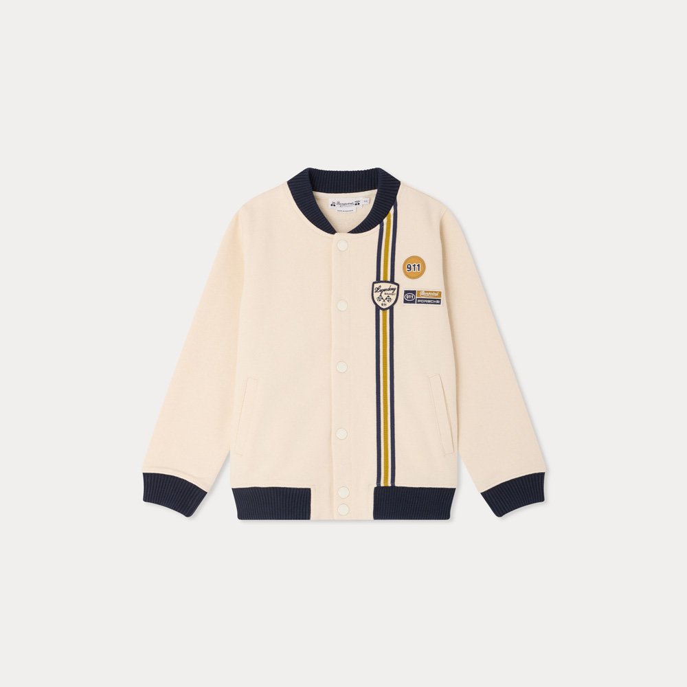 商品説明:ボンポワンとポルシェによるコラボレーションのジャケット。配色トリムや3つのパッチ、縦ストライプが特徴的なデザインです。オーガニックコットン素材を使用しています。