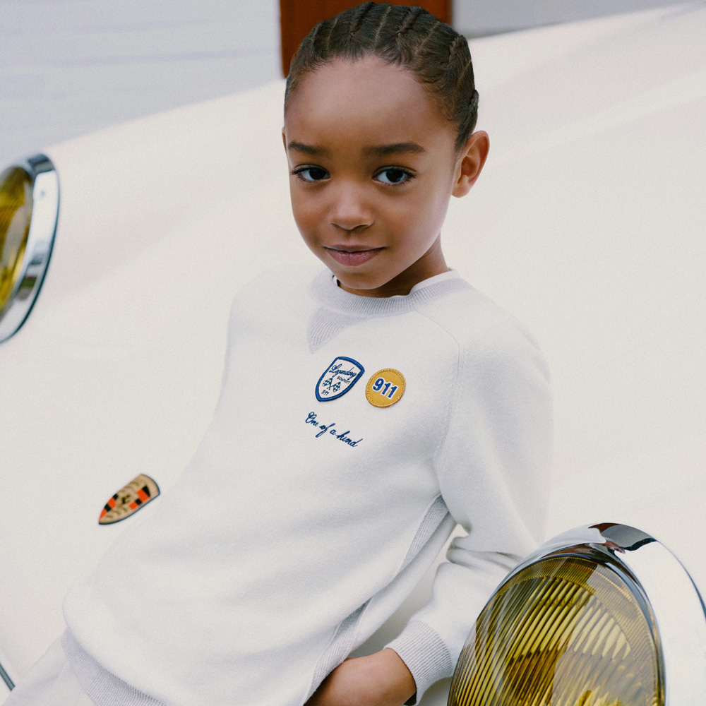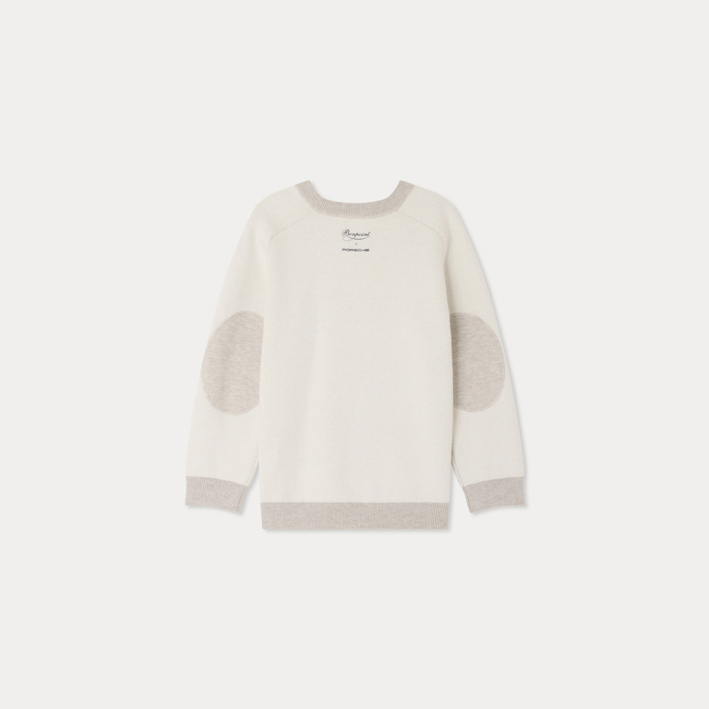 商品説明:ボンポワンとポルシェによるコラボレーションのニット。胸元のパッチやエルボーパッチ、配色トリムがアクセントになっています。オーガニックコットンにカシミヤをブレンドした素材を使用しています。