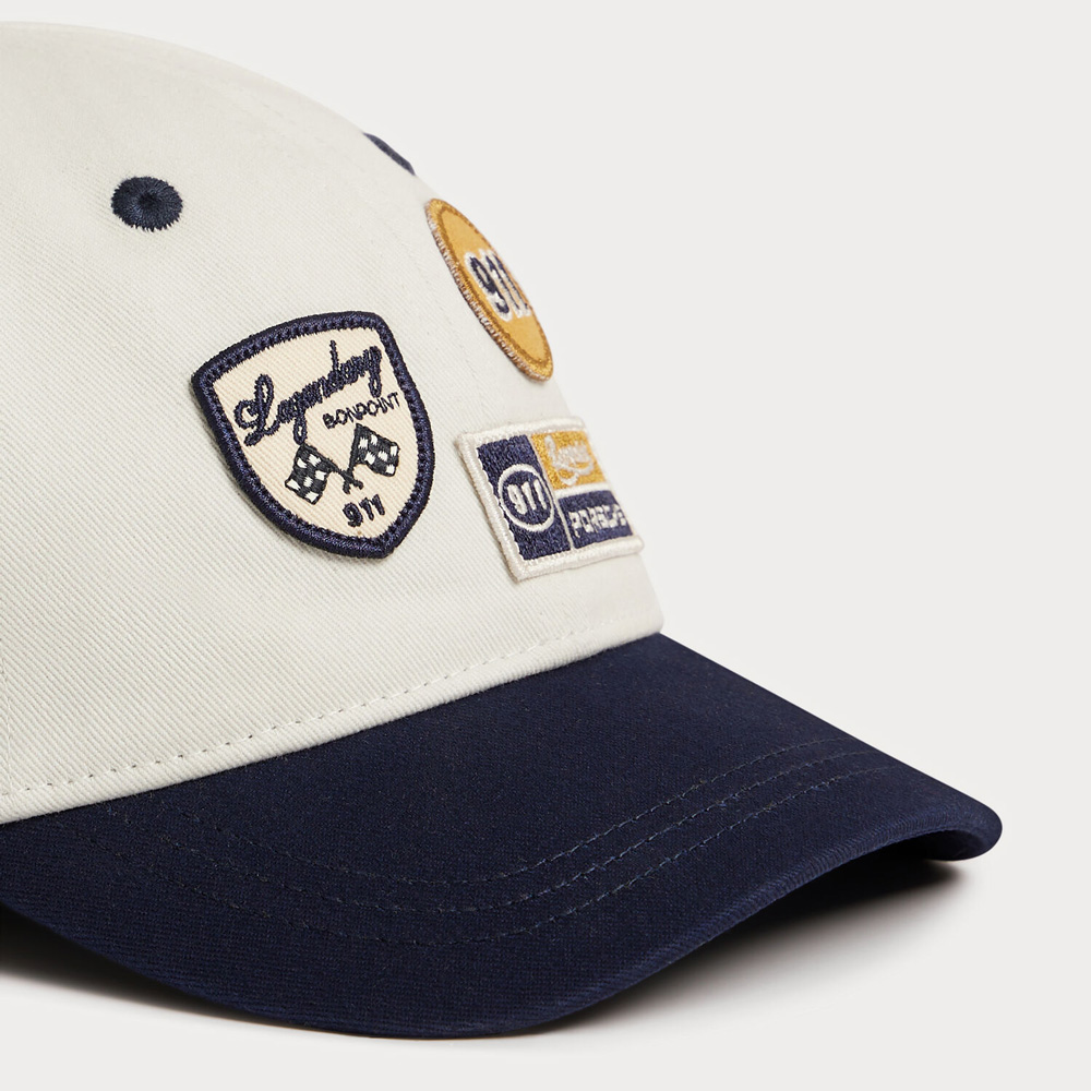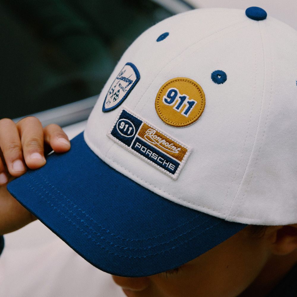 ボンポワンとポルシェのコラボレーションによるベースボールキャップ。ツートーンカラーのデザインで、フロントにはアイコニックなバッジを配しています。背面のスライド式ストラップでサイズ調整が可能です。