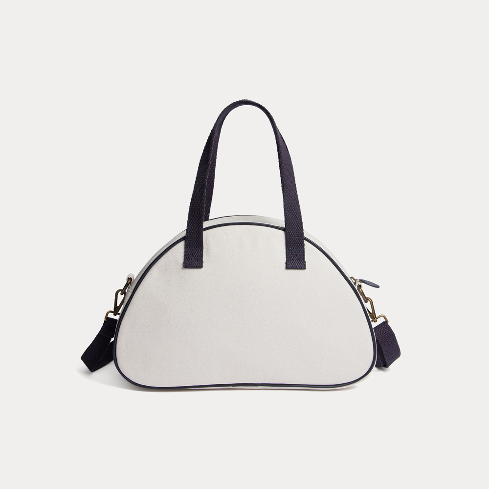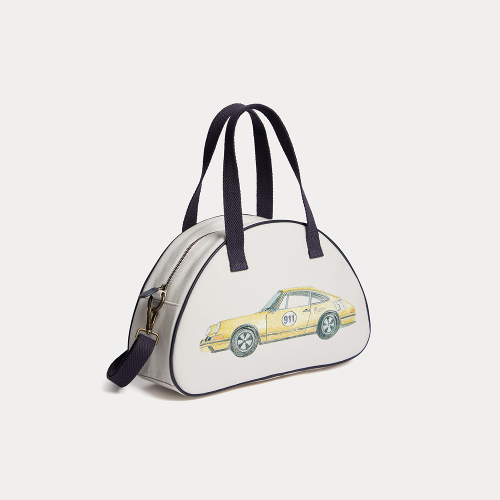 ボンポワンとポルシェによるコラボレーションのボストンバッグ。フロントにヴィンテージカーのプリントをあしらった、レトロな雰囲気のツートーンデザインです。