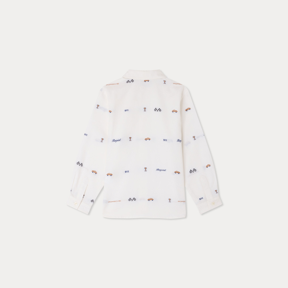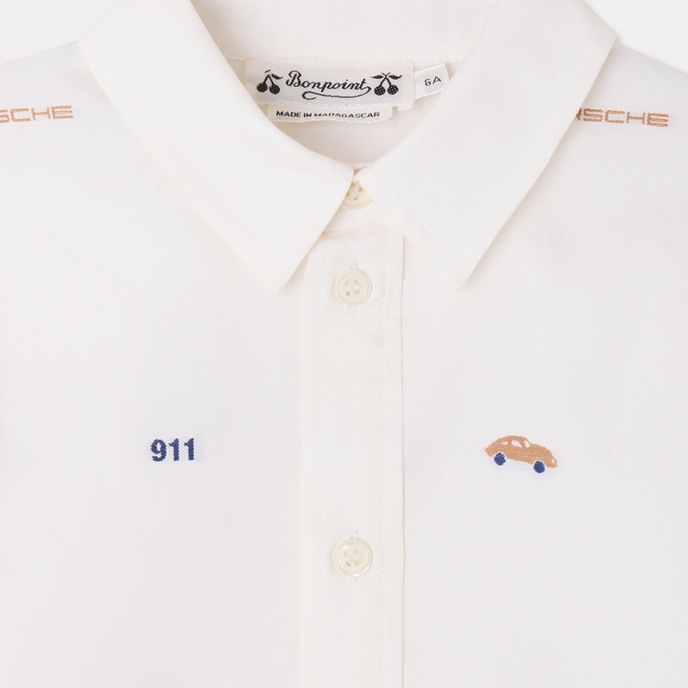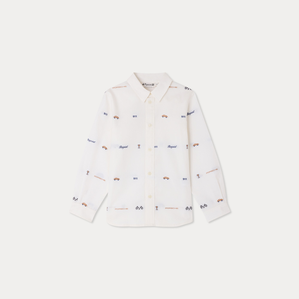 ボンポワンとポルシェによるコラボレーションのシャツ。車モチーフの刺繍を全体に散りばめたデザインが特徴です。細く軽やかなピンポイント織りのオーガニックコットン素材を使用し、クラシックなとがった襟が洗練された印象を与えます。ボタン付きカフスを備えたタイムレスな一着です。