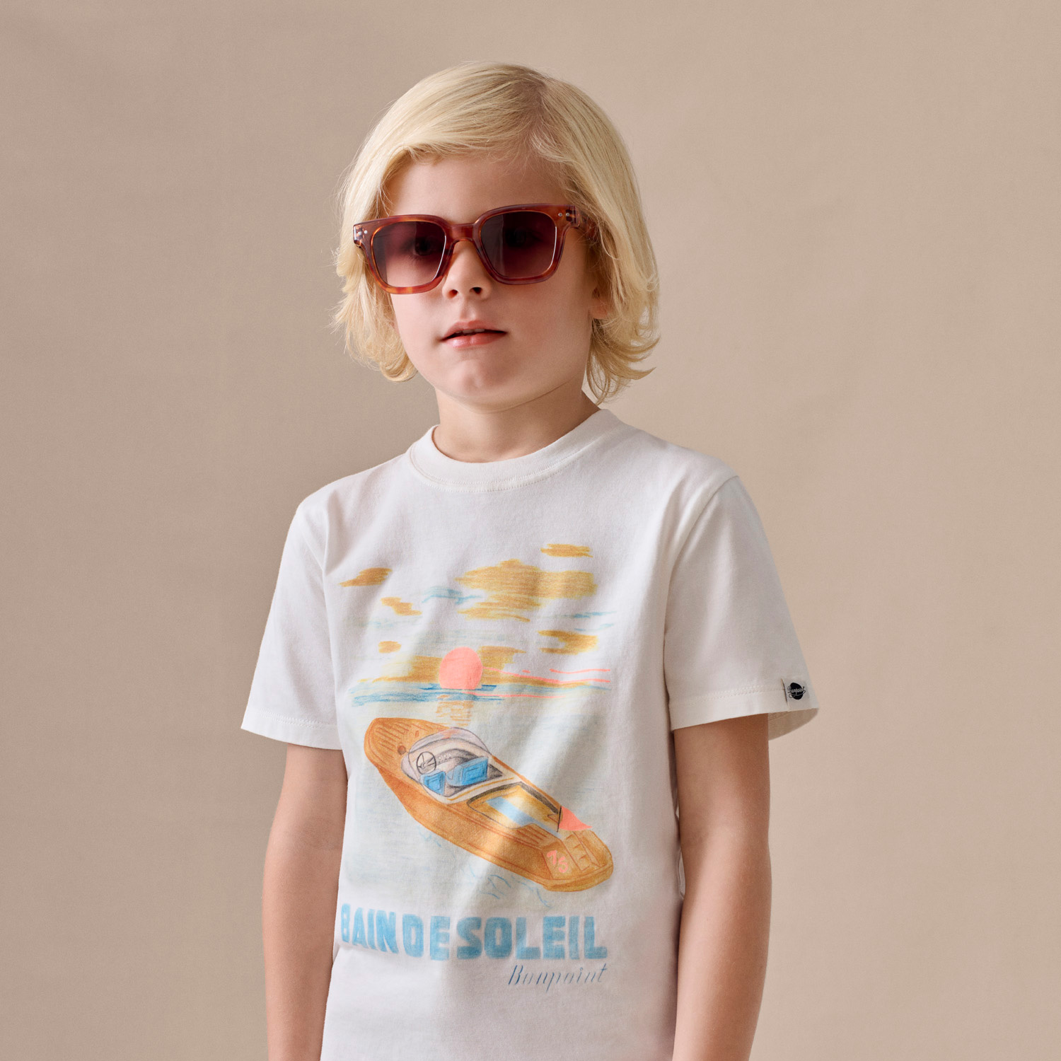 BonpointとIzipiziのコラボレーションによる子ども用サングラス。クラシックなスクエアレンズが、洗練された印象を演出します。