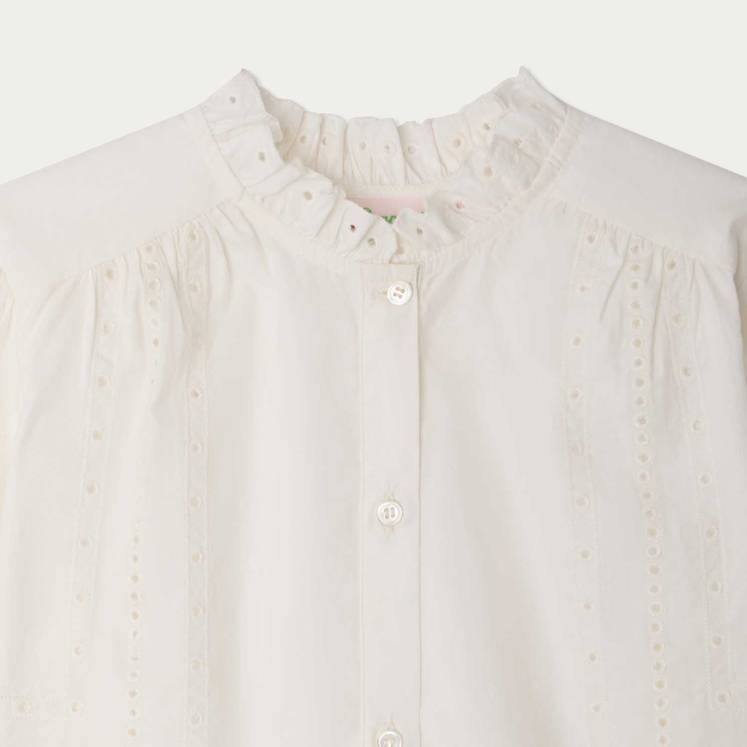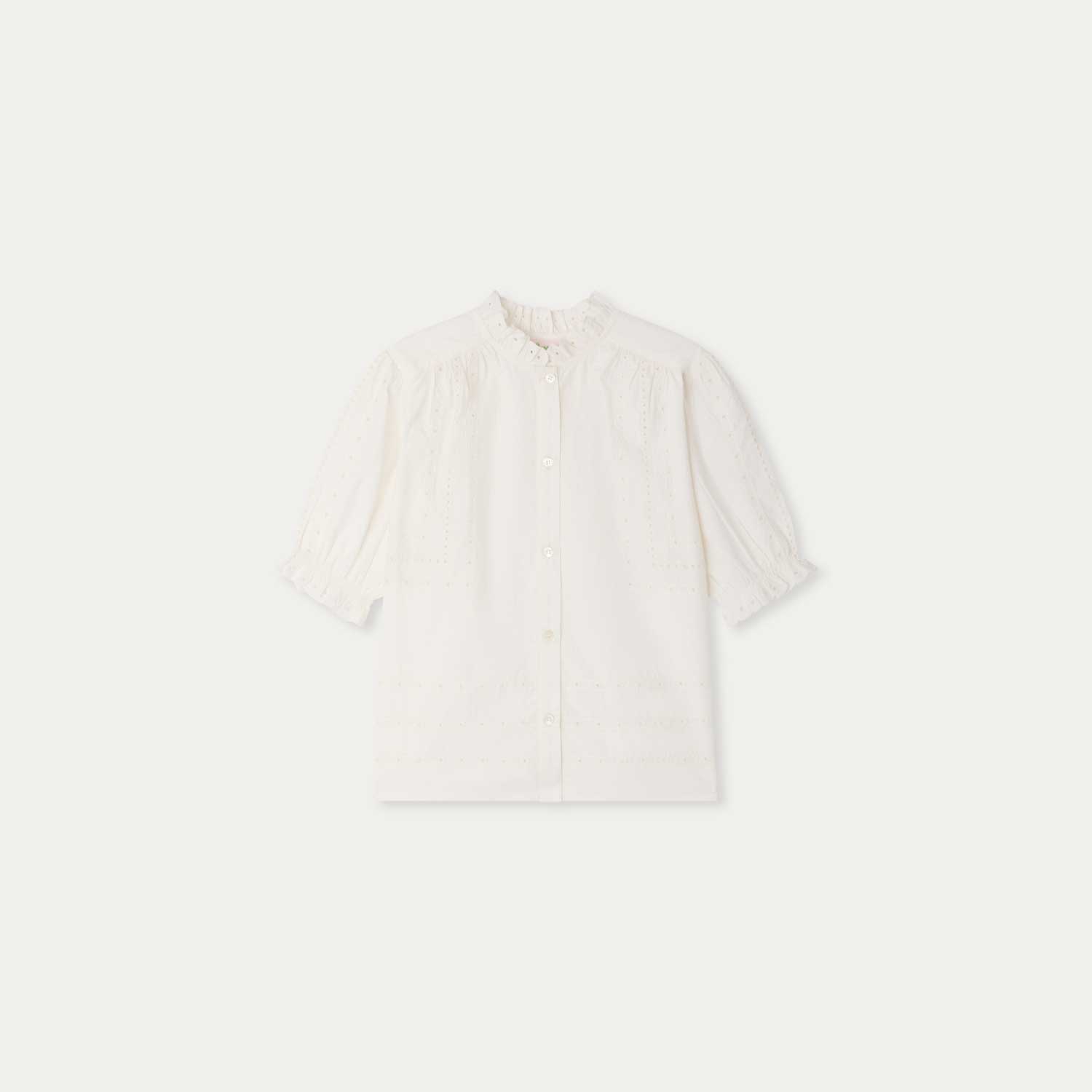 繊細なブロデリー・アングレーズ(アイレット刺繍)を施した、上品な印象のブラウス。やさしく丸みのあるパフスリーブには細かなフリルをあしらい、フリル付きの小さな襟がデザインのアクセントになっています。オーガニックコットンのポプリン素材を使用し、軽やかで快適な着心地です。フロントは控えめなパール調ボタンで留める仕様です。
