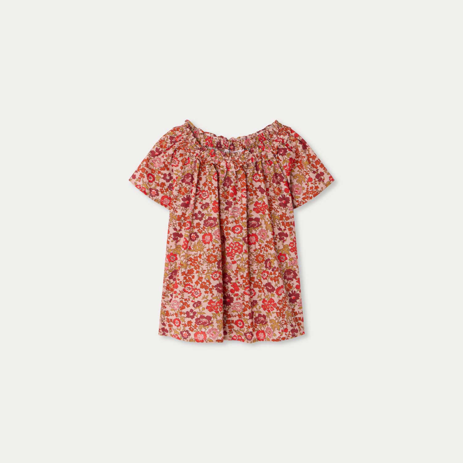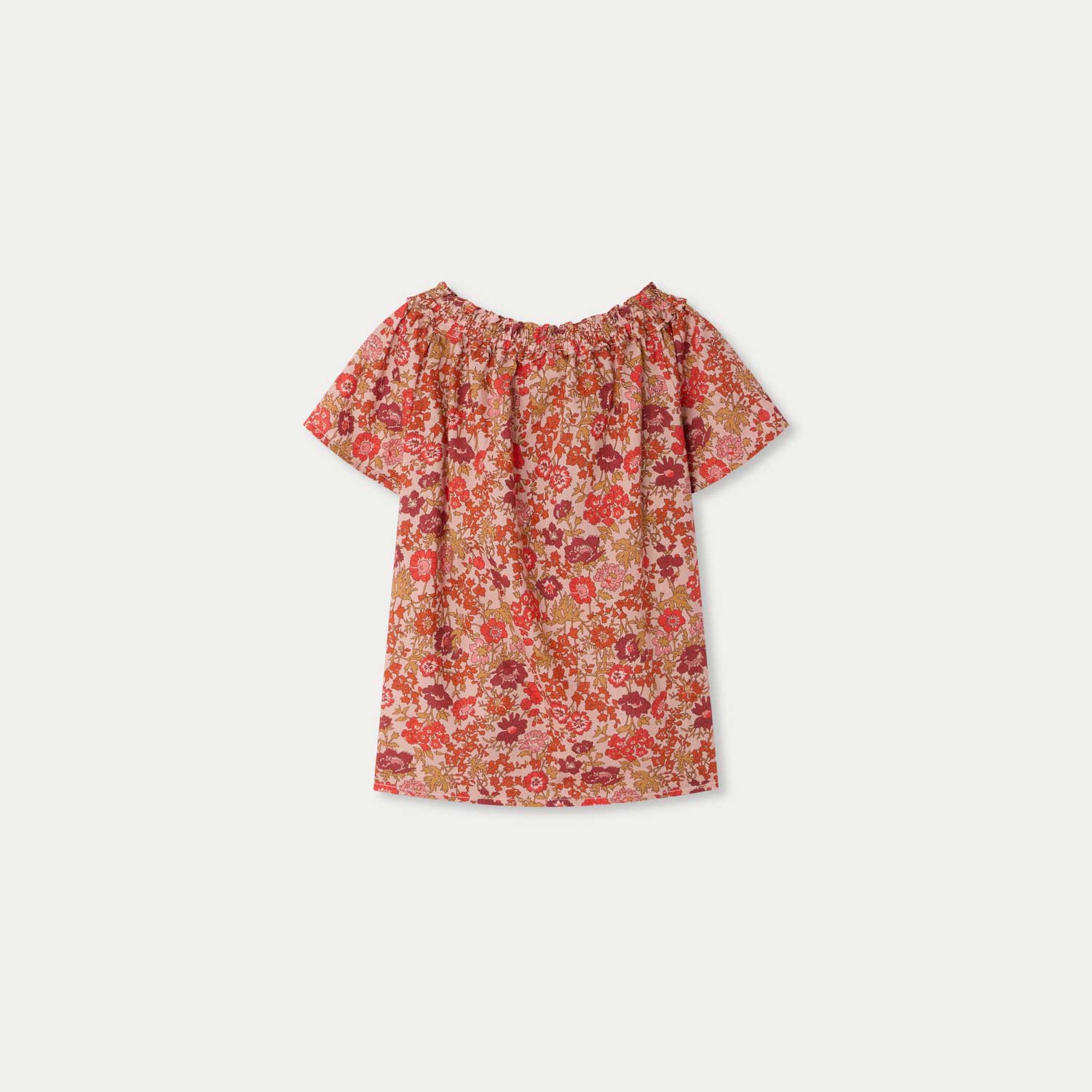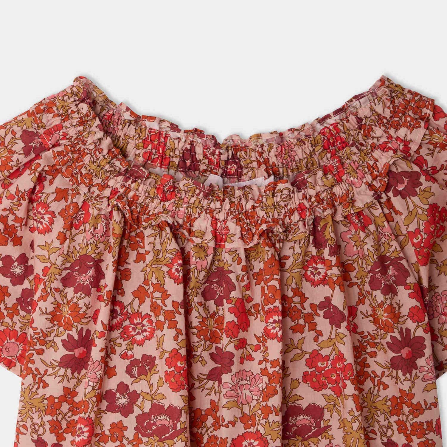 アイコニックなリバティ・タナローンのフローラルプリントを使用したブラウス。ネックラインには3列のゴムシャーリングを施し、胸元下のプリーツがやわらかな立体感を生み出します。ショート丈のラグランスリーブが、軽やかな印象です。