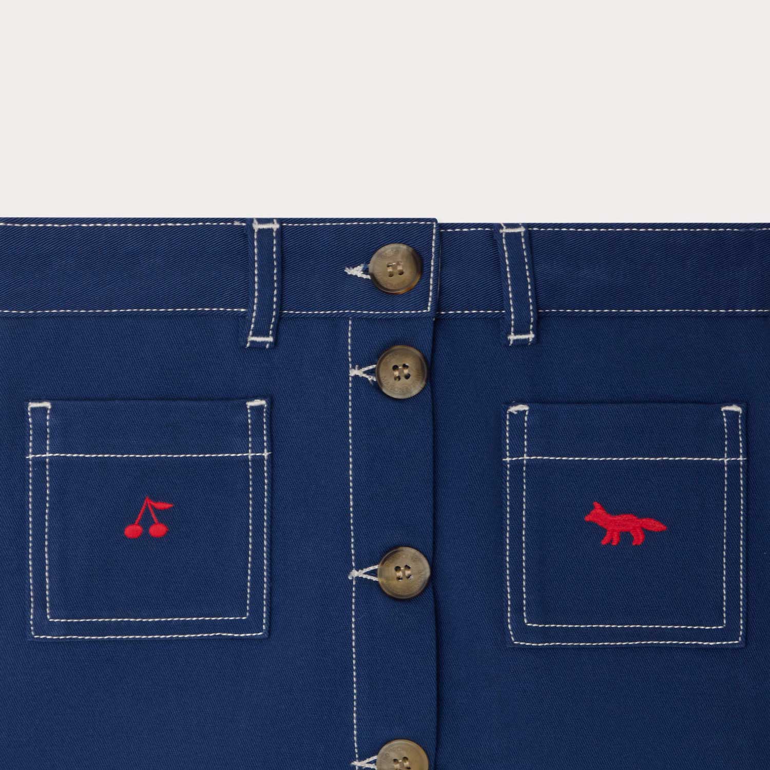 BonpointとMaison Kitsunéのコラボレーションによって生まれたスカート。コントラストの効いたチェリーとフォックスの刺繍が特徴です。フロントはホーン調ボタンを配したフルオープン仕様です。
