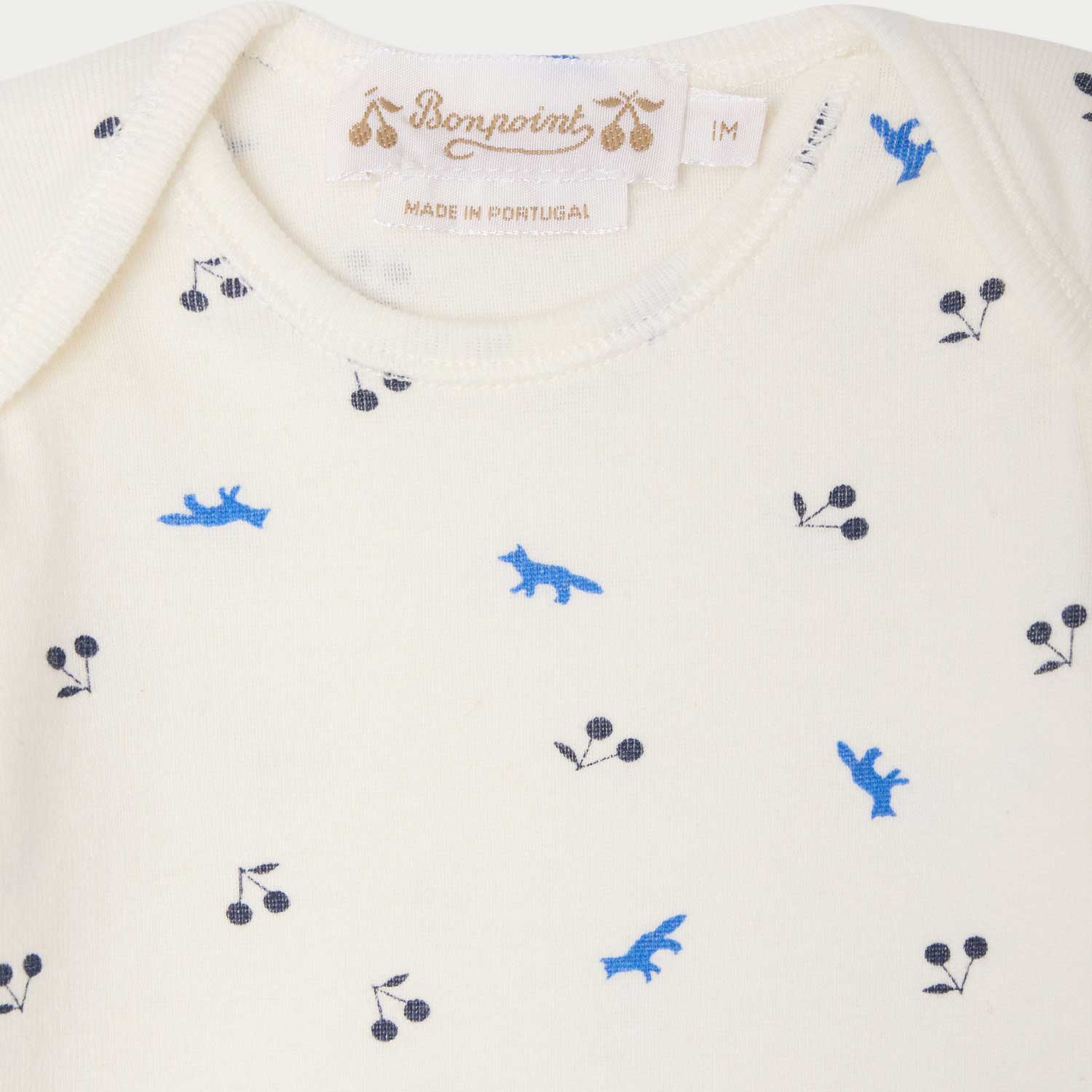 ボンポワンとメゾン キツネによるコラボレーションのセットアップ。フォックスとチェリーを描いた愛らしいプリントが印象的です。オーガニックコットン素材を使用し、エンベロープネックで着脱しやすいデザインです。