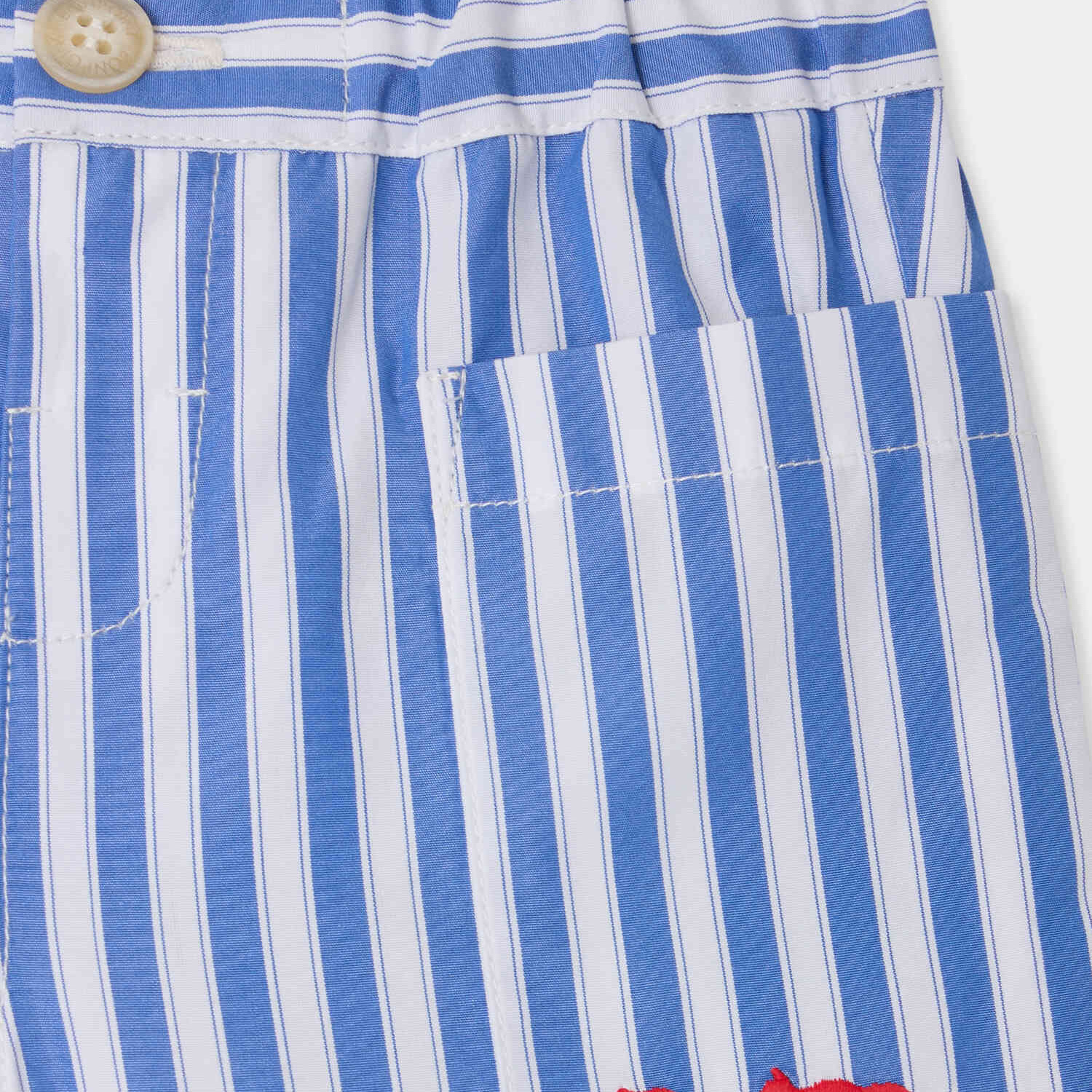 ボンポワンとメゾン キツネによるコラボレーションのショートパンツ。オーガニックコットン素材を使用し、フロントポケットには配色モチーフの刺繍をあしらっています。