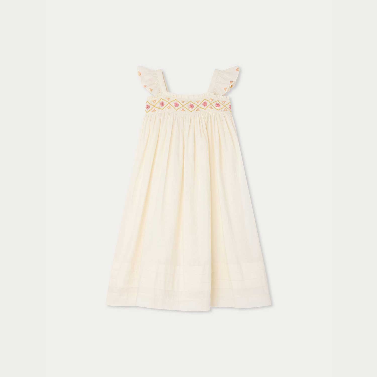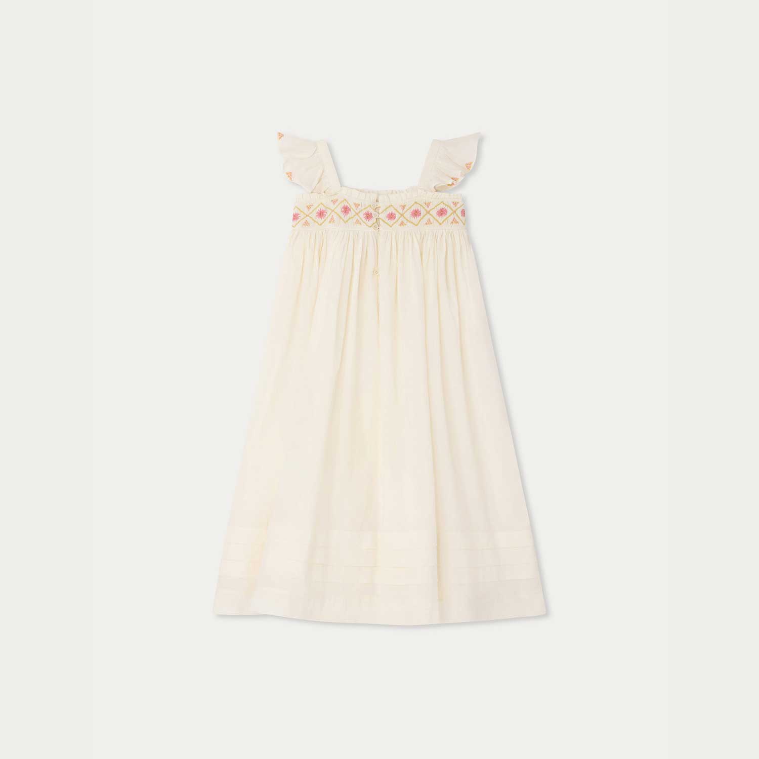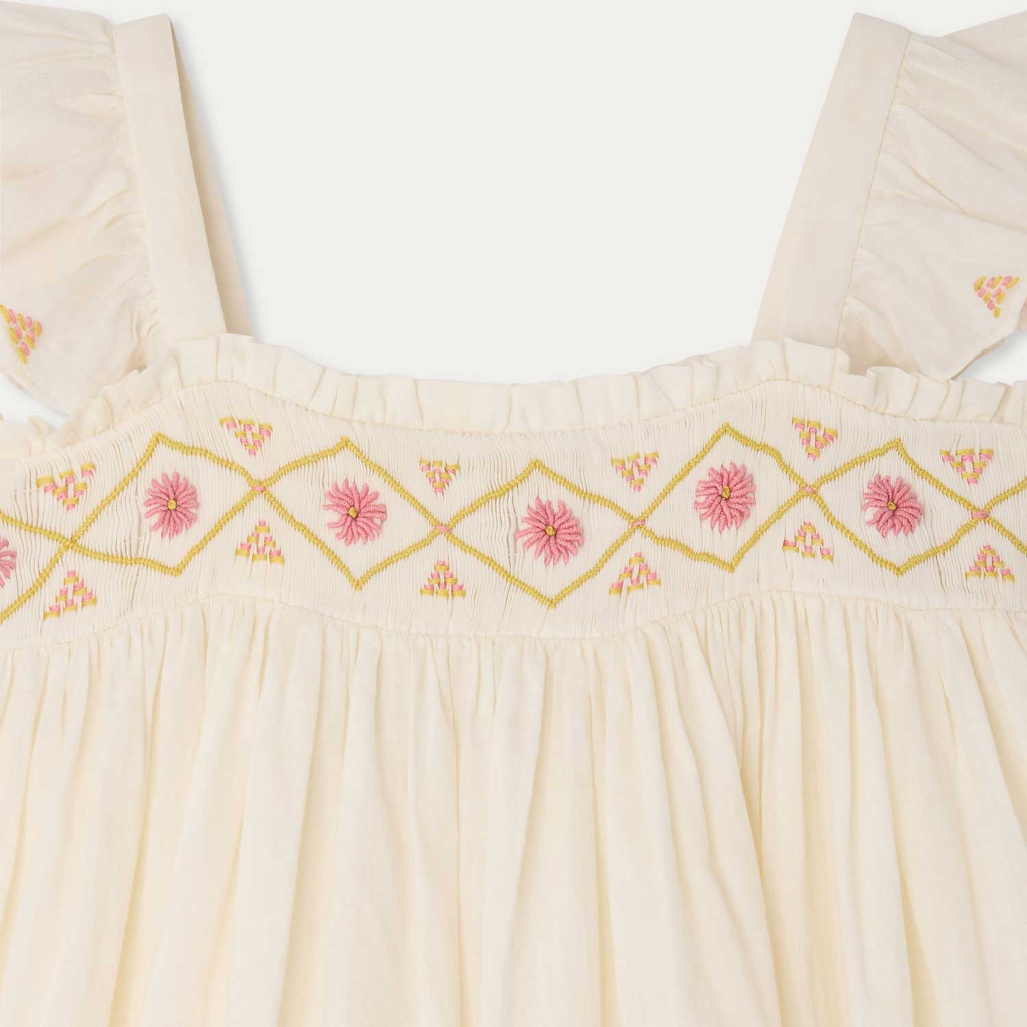 色とりどりの花を描いた手刺繍スモッキングが目を引くドレス。スクエアネックラインには繊細なフリルを添え、フリル付きショートスリーブにも刺繍モチーフをあしらっています。裾には横方向のタックを施し、軽やかな動きを加えています。