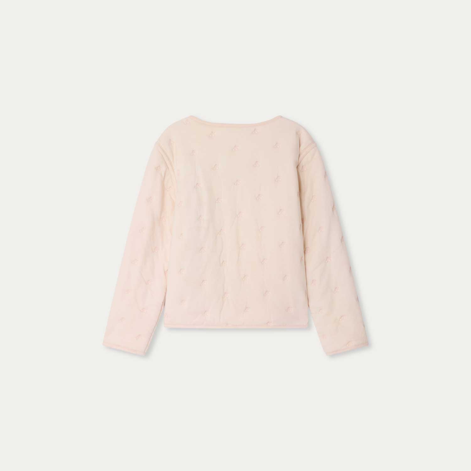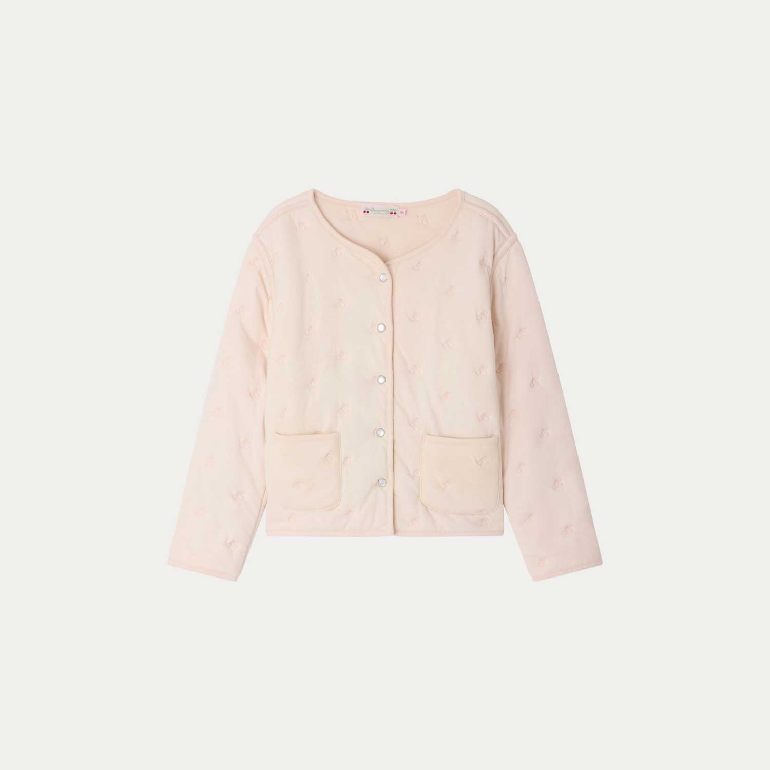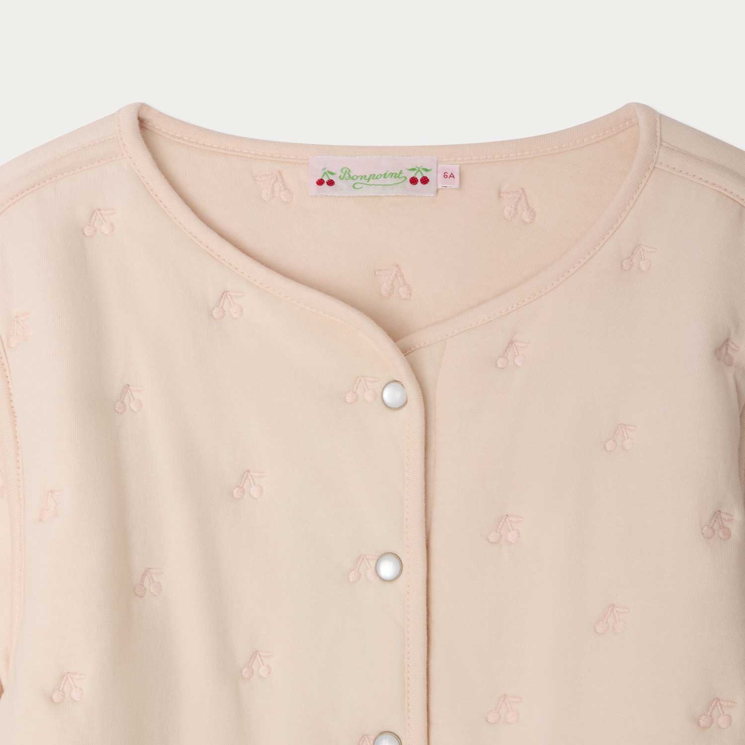 やわらかなオーガニックコットン素材を使用したジャケット。フロントにはパッチポケットを2つ配し、実用性も備えています。チェリー刺繍によってキルティングのような立体感のある表情を生み出しています。