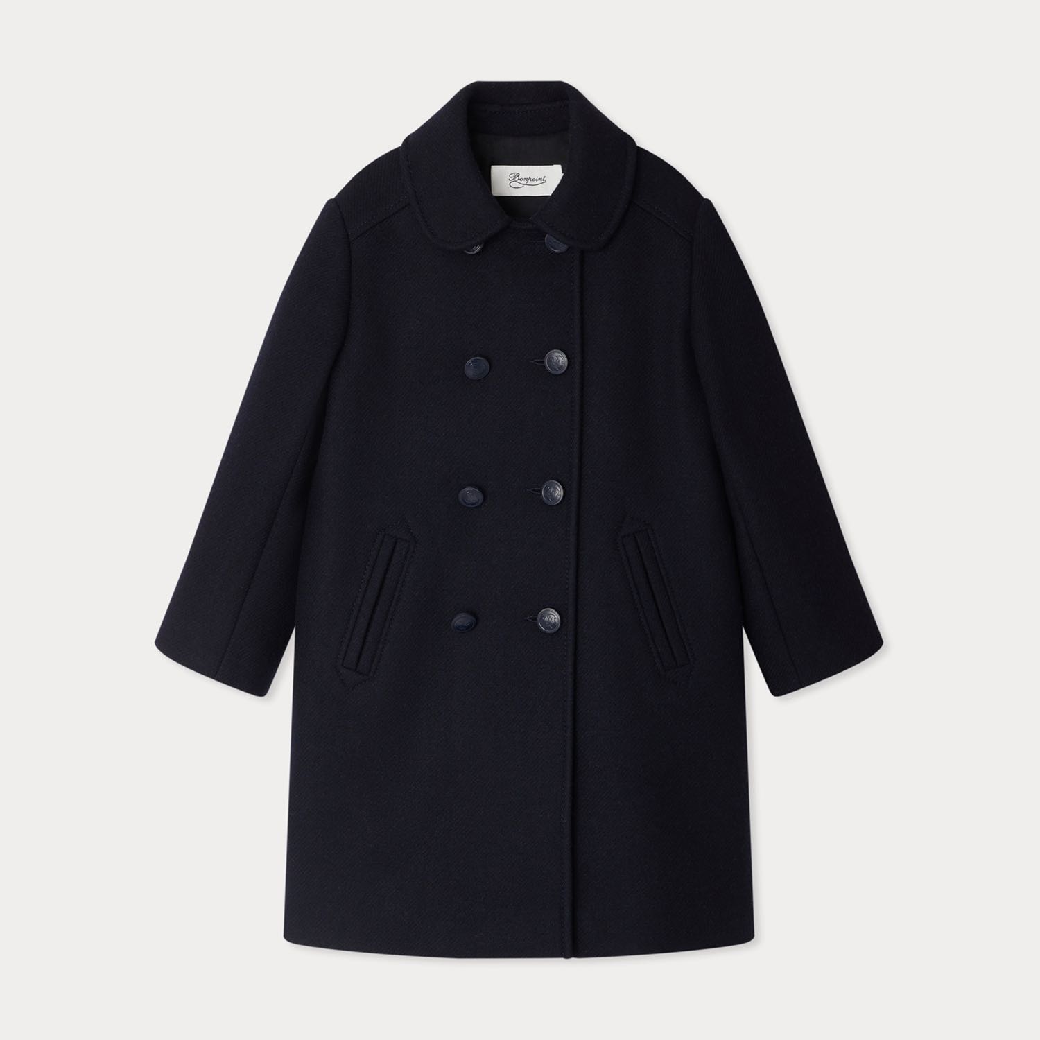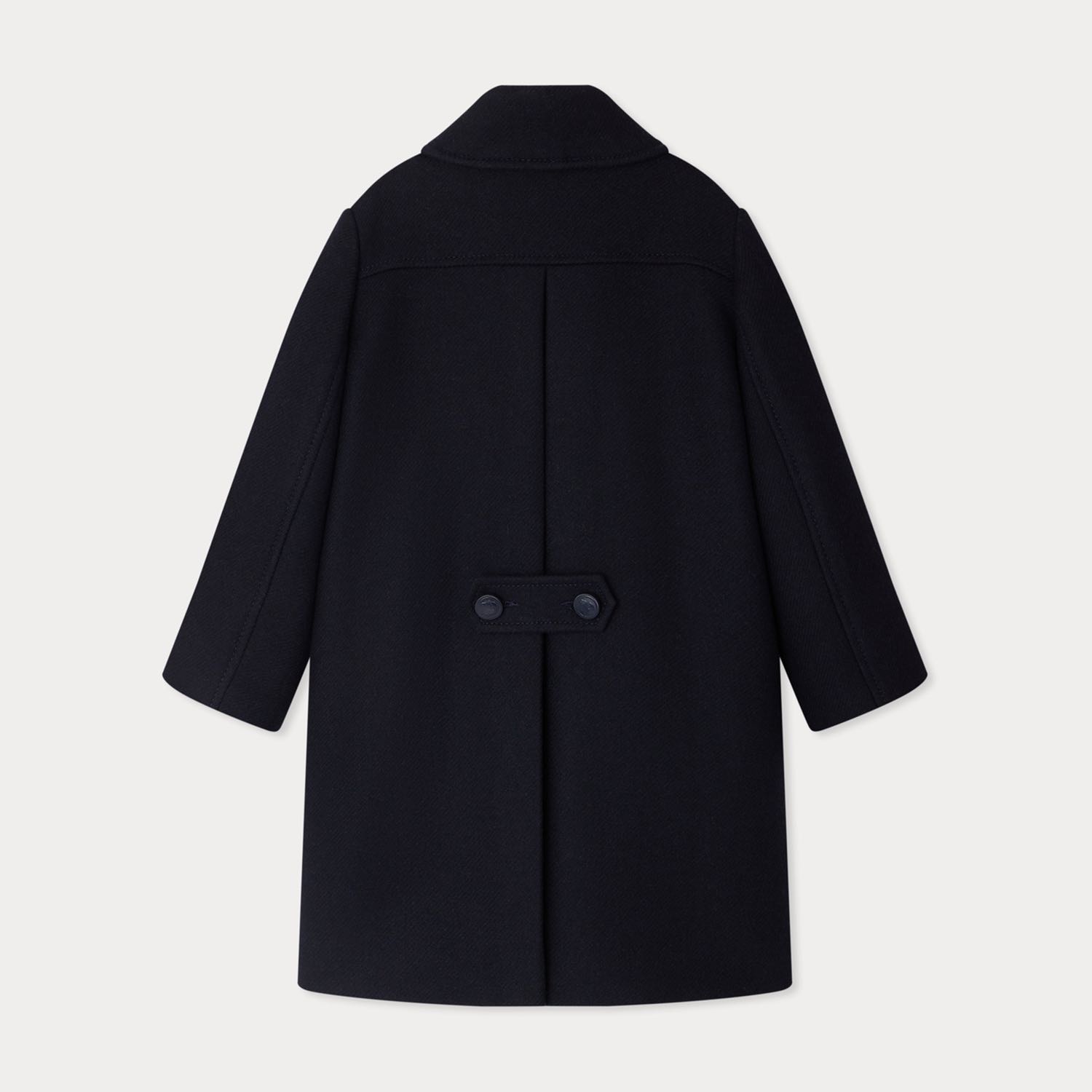 あたたかなウール素材を使用し、バックにはボタン付きハーフベルトとプリーツをあしらうことで、後ろ姿にも美しいアクセントをプラス。フロントには斜めに配したウェルトポケットと、オリジナルモチーフをあしらった大きめボタンのダブルブレスト仕様が、完成度の高いデザインに仕上げています。