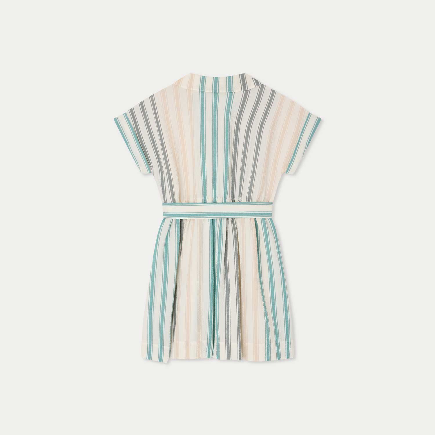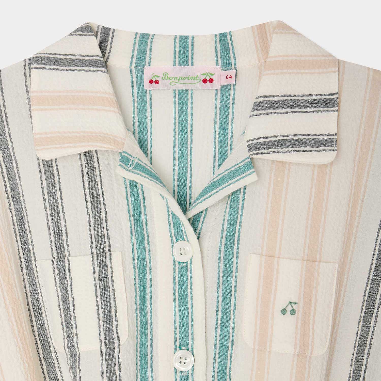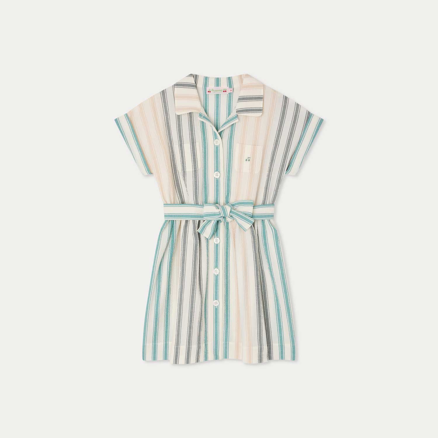 マルチカラーの縦ストライプが印象的な、シアサッカー素材のシャツドレス。共布のリボンベルトとウエストゴム仕様により、心地よくフィットします。折り返しデザインのショートスリーブと、胸元のパッチポケットのひとつに施したチェリー刺繍が、さりげないアクセントです。