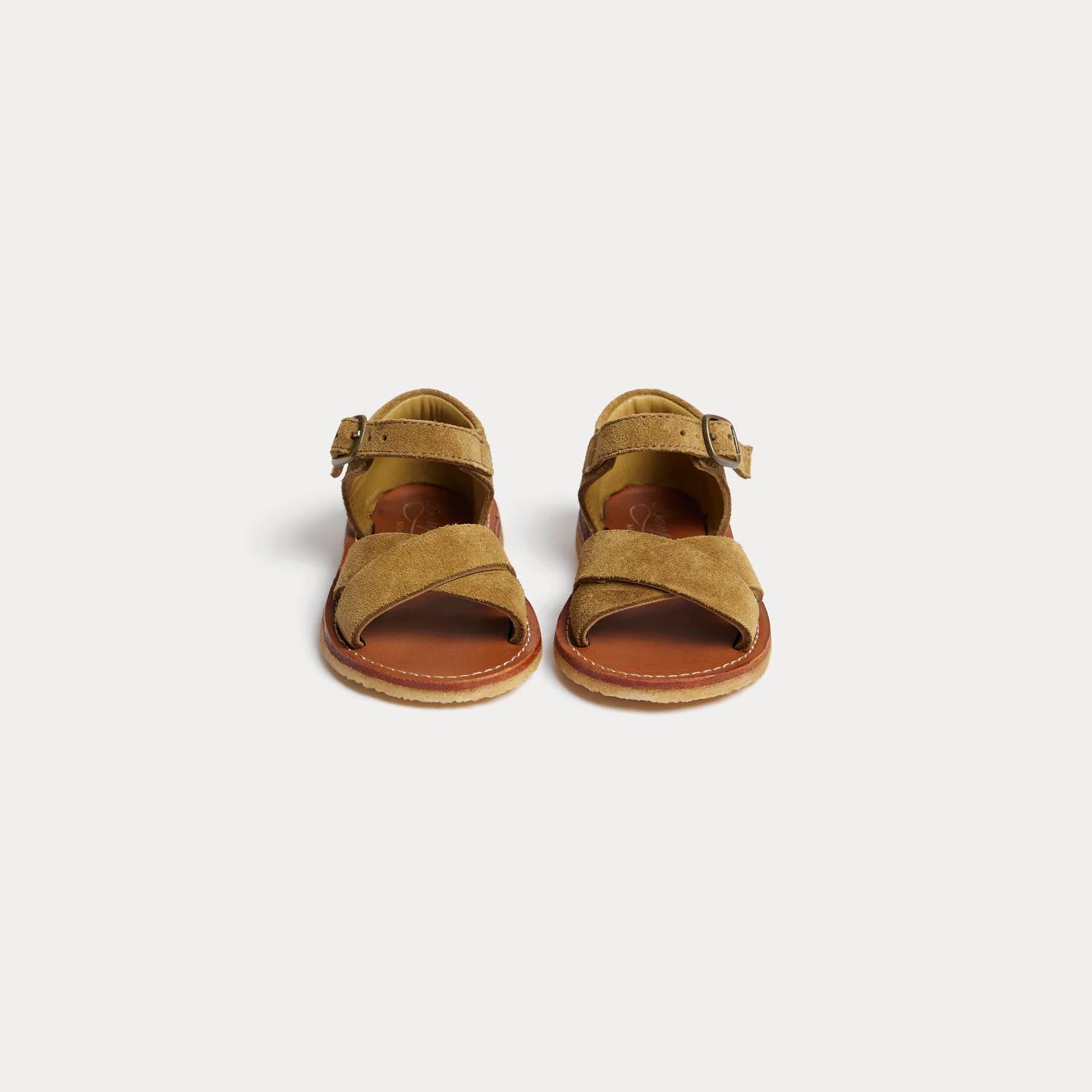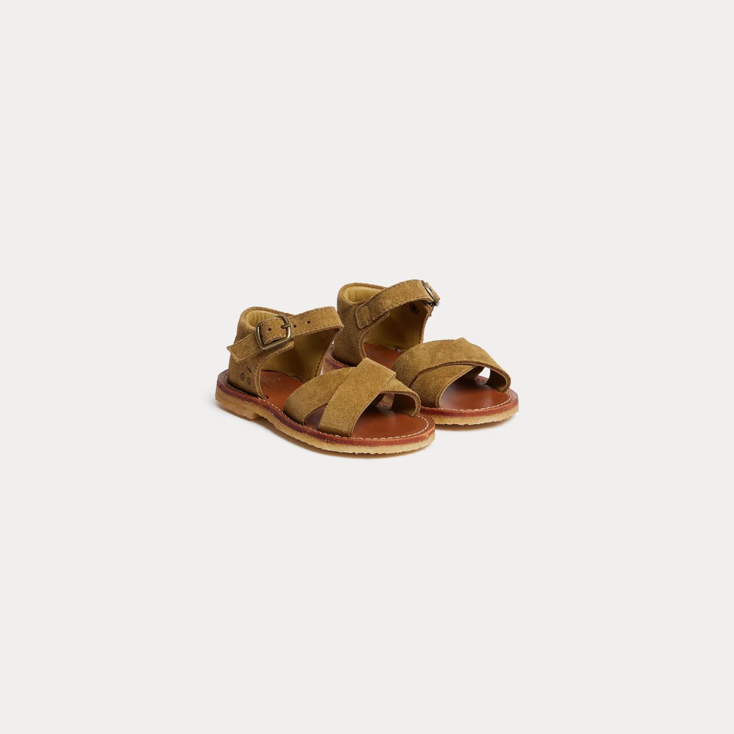滑りにくいソールを備えた、初めての歩行に適したサンダル。オープントゥのデザインに、特徴的なクロスストラップを配しています。
