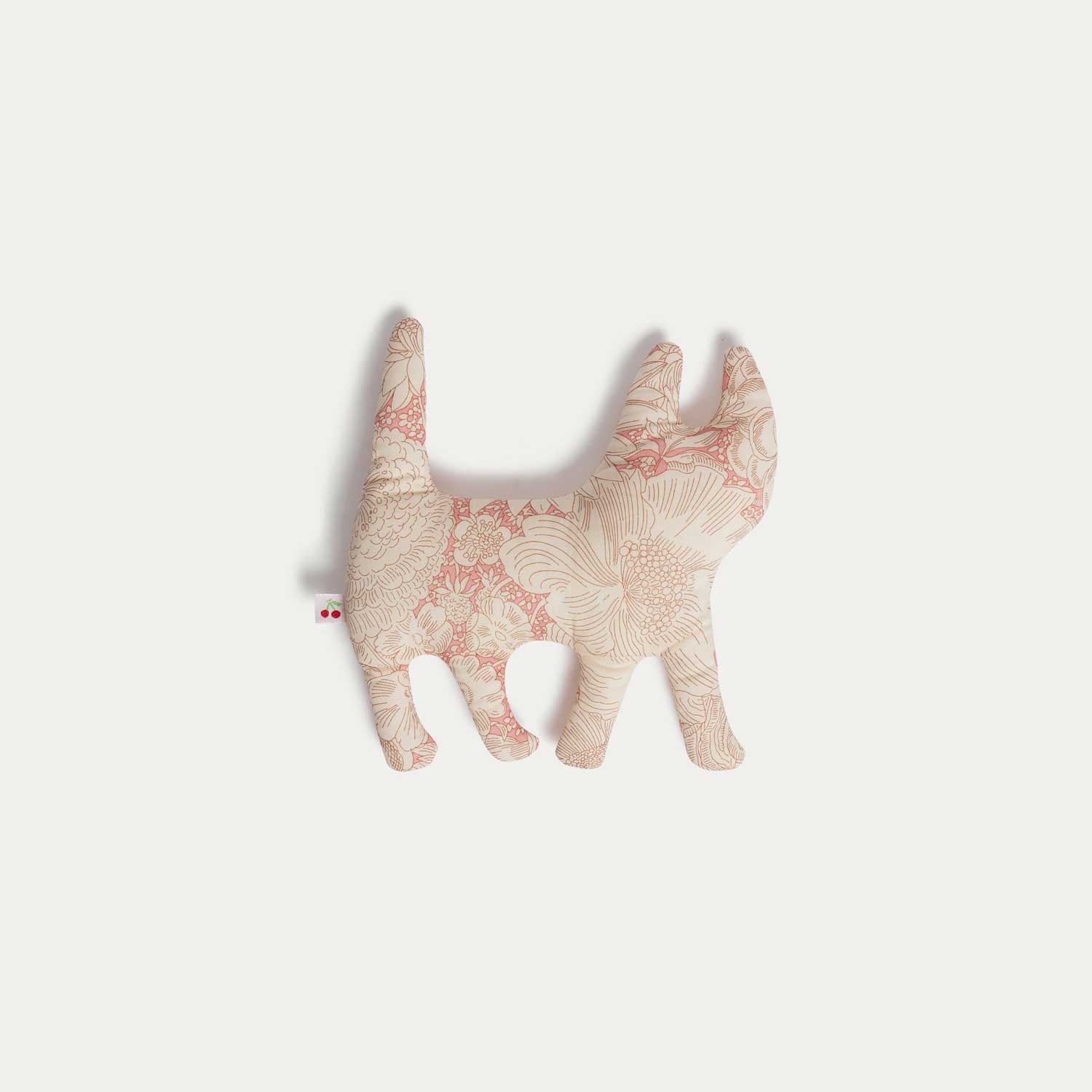 フローラル柄のコットンポプリンのリバティファブリックを使用した、ねこモチーフのぬいぐるみ。やわらかな中綿入りで、小さな手でも握りやすいサイズ感です。