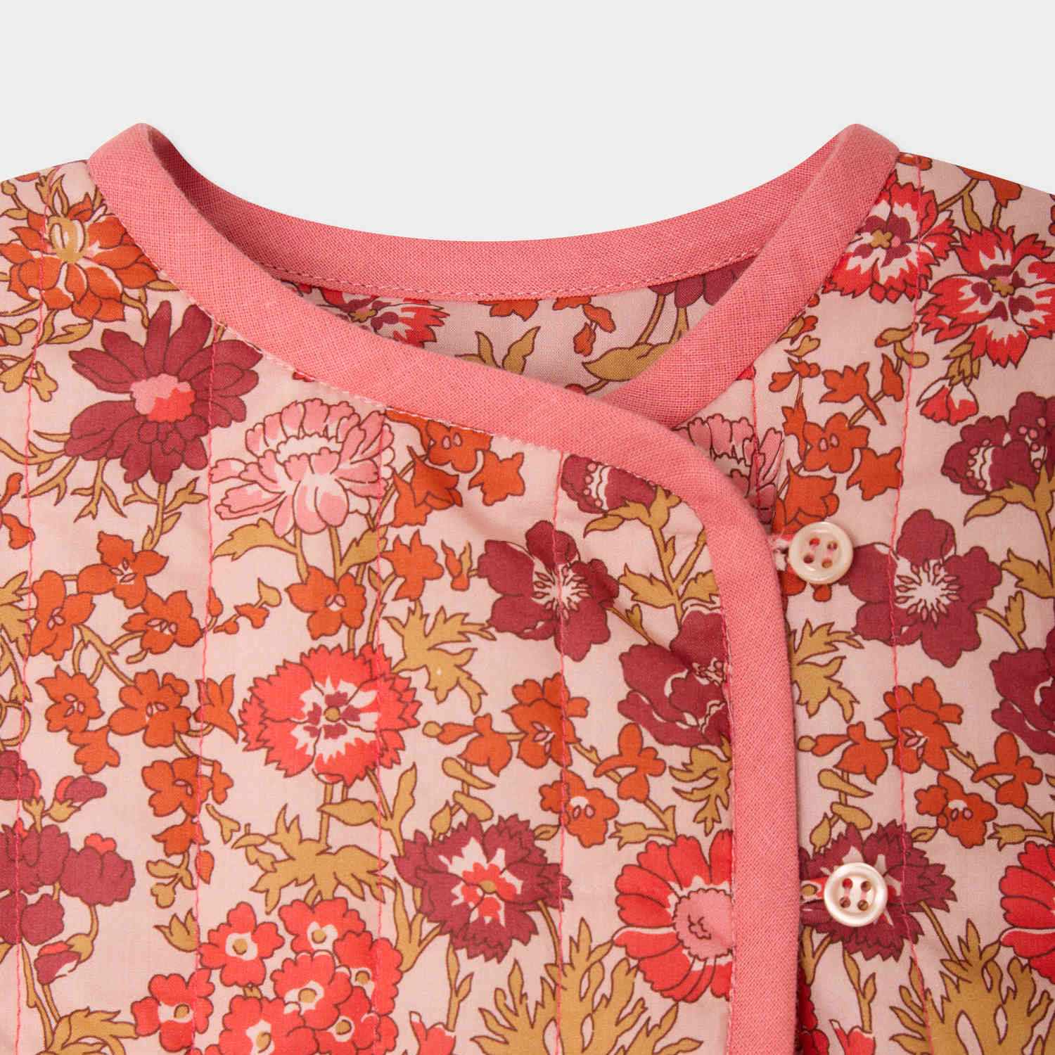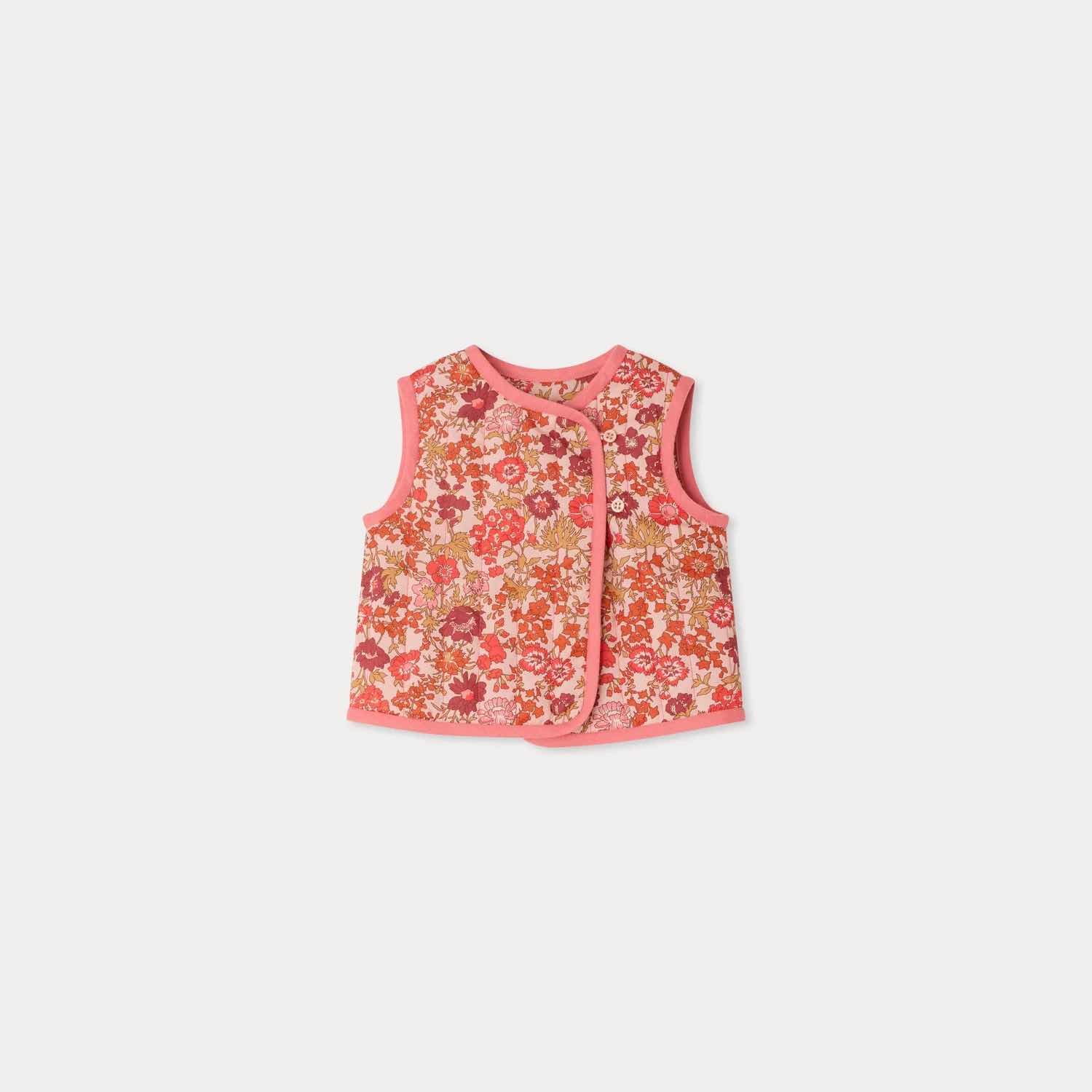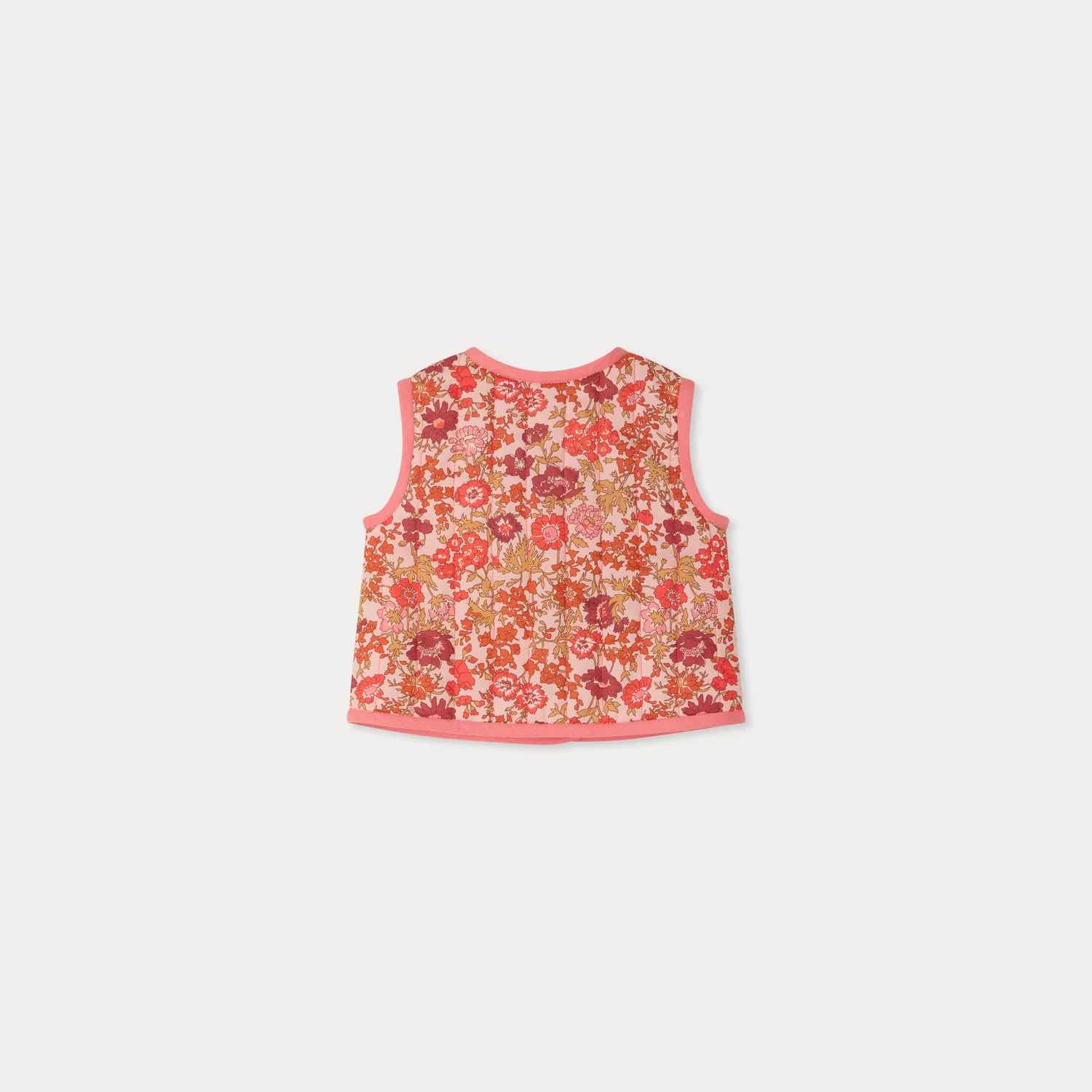 オーガニックコットン素材を使用した、リバティファブリックのベスト。明るいカラーのロマンティックなフローラルプリントが印象的です。キルティング仕様に、コントラストの効いたトリムで仕上げています。