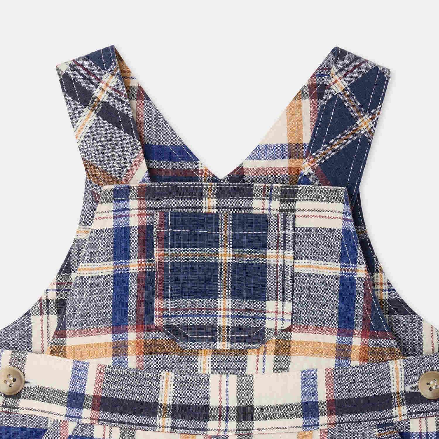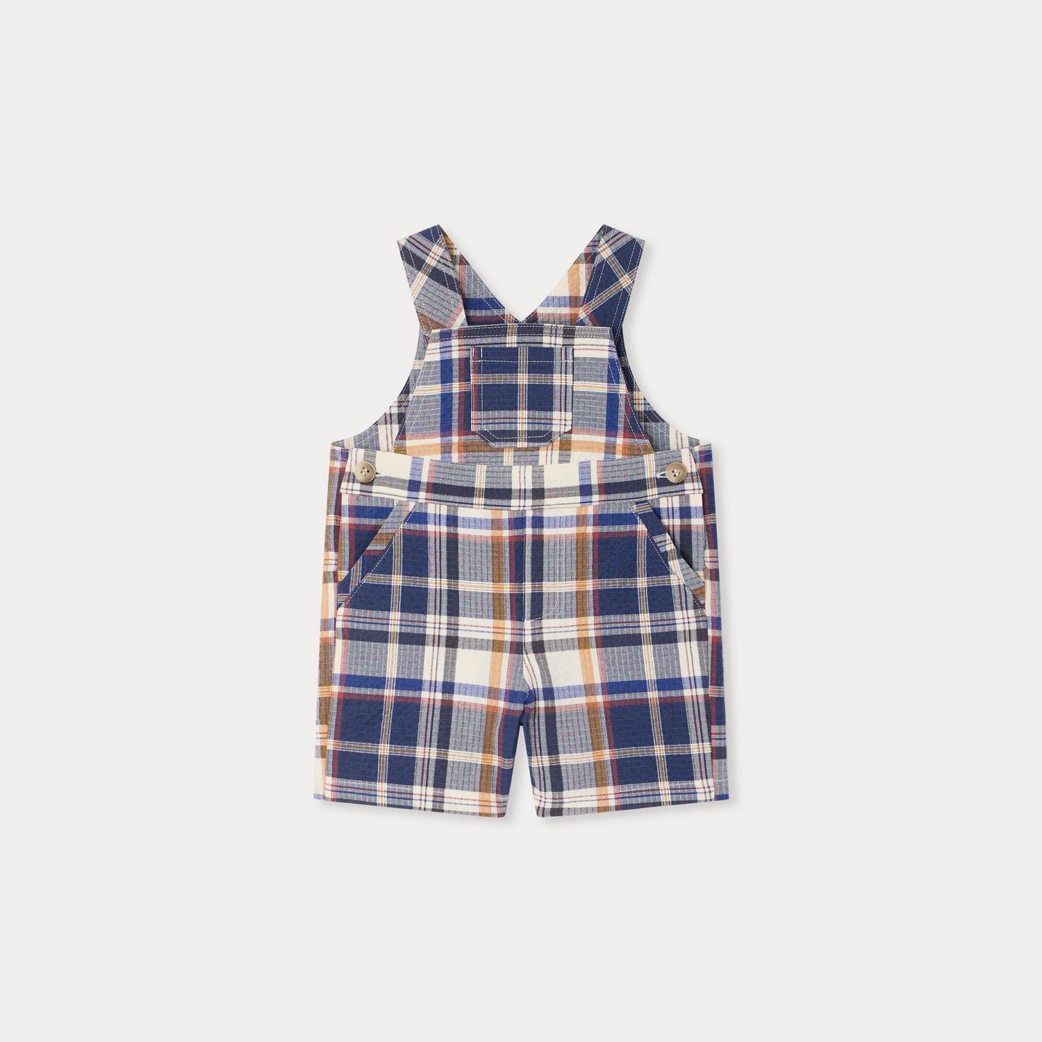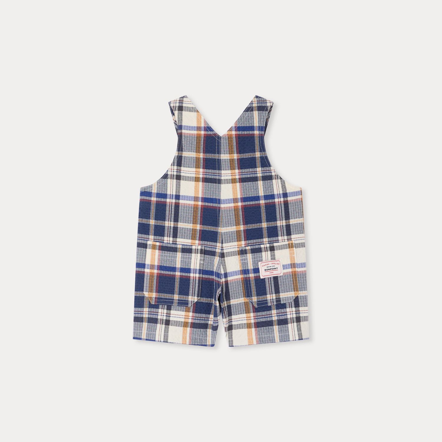 タータンを思わせるチェック柄が特徴のオーバーオール。コットン混素材を使用し、背面の2つのポケットのうち1つにはBonpointラベルをあしらっています。